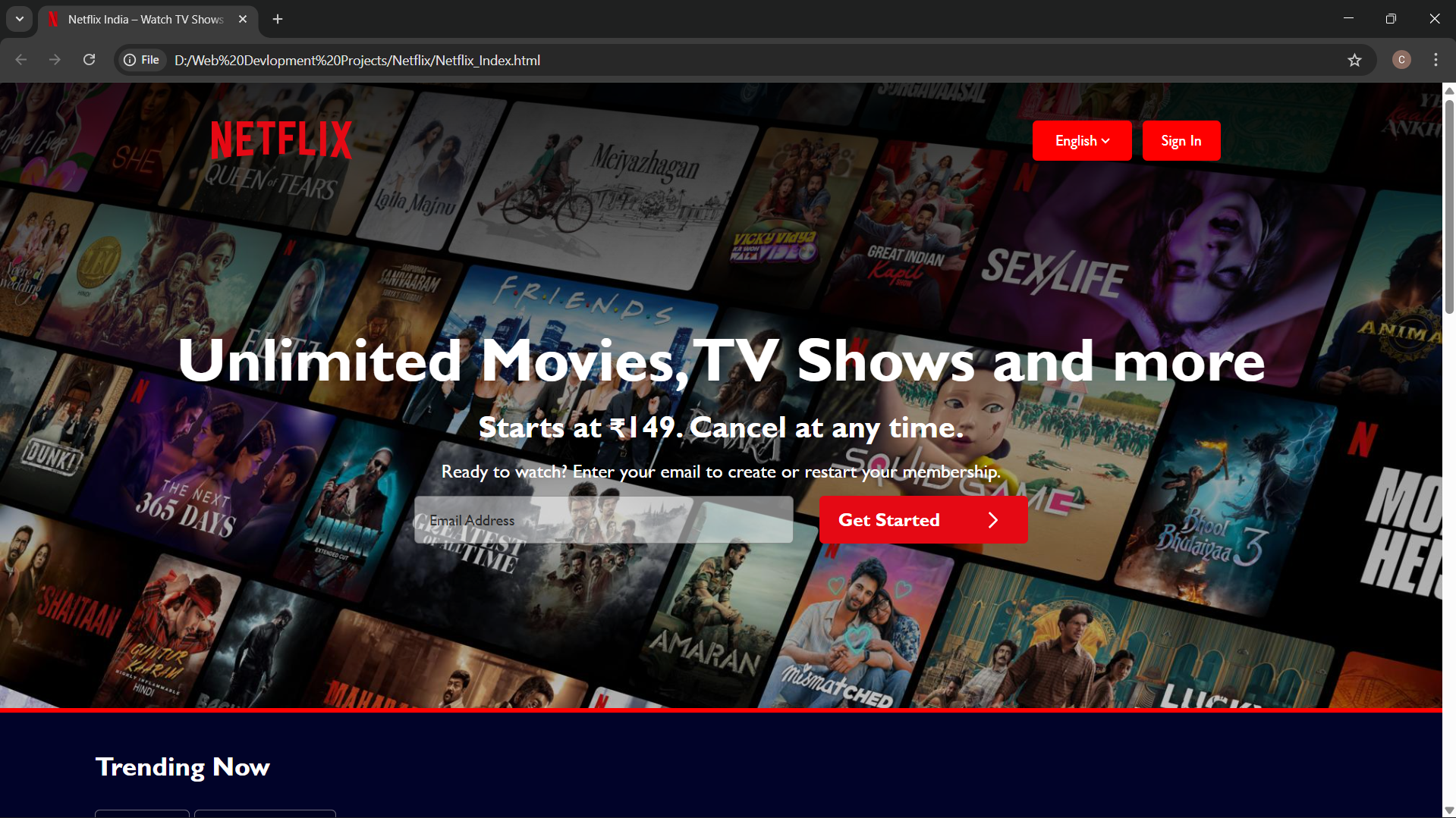 This project recreates the look and feel of the Netflix homepage with modern layout, movie thumbnails, banners, and responsive styling.